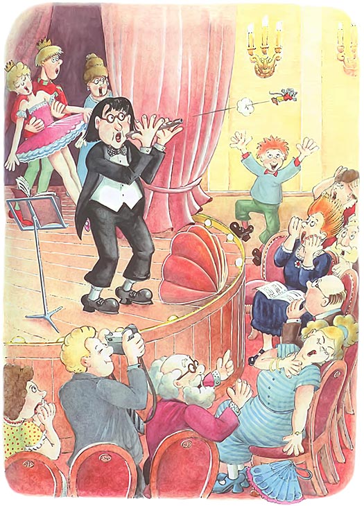 Но самое главное было не это, самое главное было в конце. Дело в том, что мне приходилось крепко держаться за края флейты, потому что, когда дядюшка-музыкант играл, мне в спину всё время дуло. И вот, когда нам нужно было взять самую высокую ноту, дядюшка набрал в лёгкие побольше воздуха, да как дунет — я не удержался и, словно пуля, вылетел из флейты. Перенёсся через весь зал и шлёпнулся прямо у выхода. Публика от восхищения вскочила с кресел.