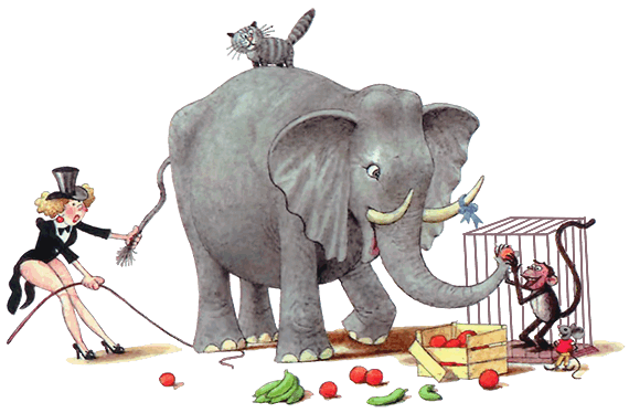 Ещё раз здравствуйте! Какая приятная встреча! А я уже думал — больше не увидимся… Что же вы опять не туда смотрите? Это же слон. А я — здесь внизу, возле мартышкиной клетки. Помните, мы с вами знакомились у тётушки Марины? Давно это было, много крупы с тех пор просыпалось. Вот уж действительно не знаешь, где встретишь старых друзей. Правду говорят, что все дороги ведут в цирк… А как вы узнали, что я теперь выступаю в цирке? Ах, вы просто пришли на экскурсию. Это правильно. К нам в цирковые конюшни каждый день приходят взрослые и дети. Звери любят смотреть на разные экскурсии. Это место по старинке называется «конюшнями», а живут здесь разные звери, все, которые выступают в цирке.