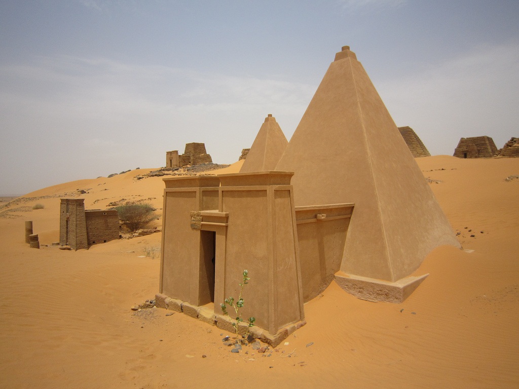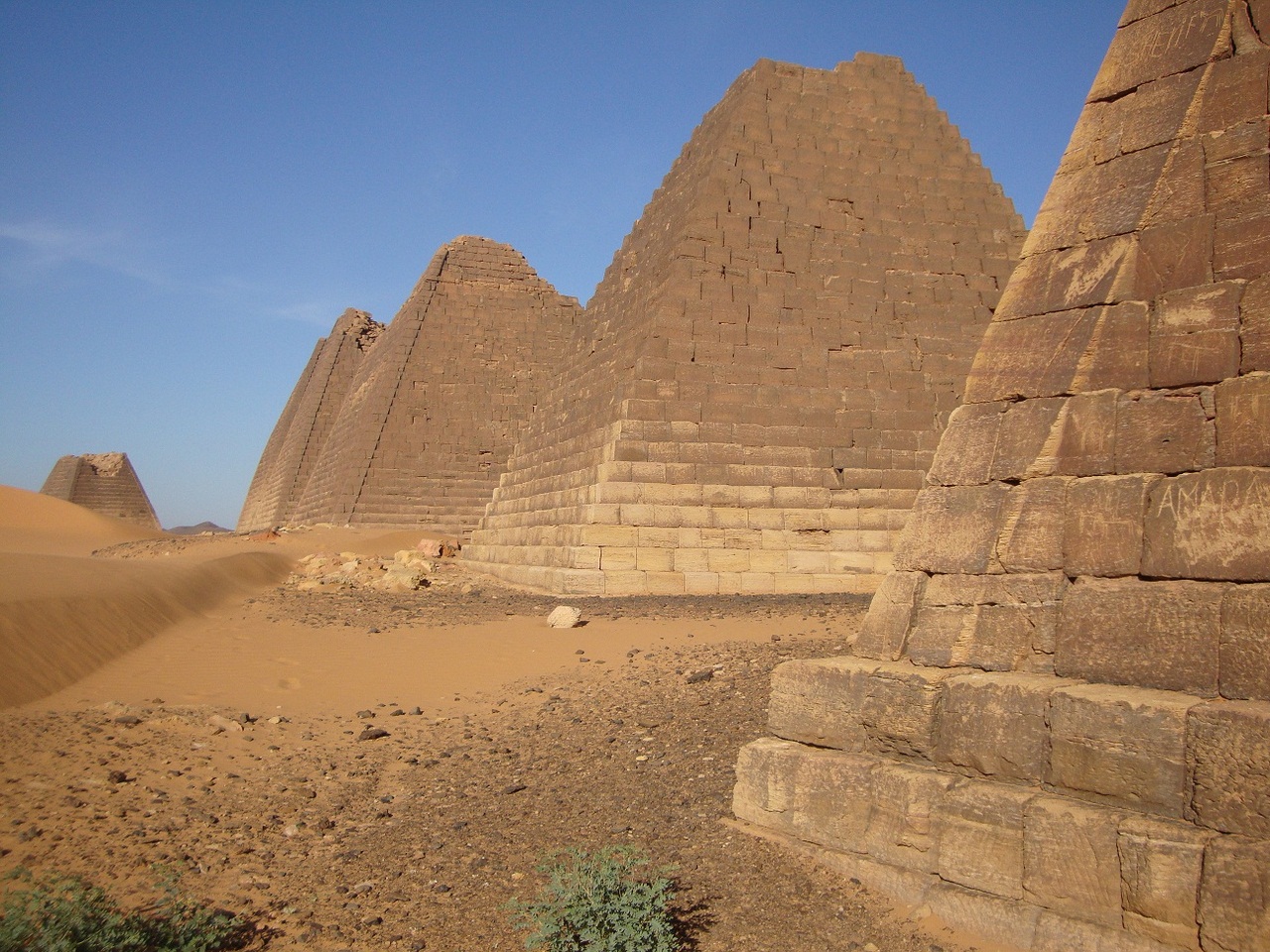 Там, дальше, из песка торчали вершки пирамид. Совсем не больших по сравнению с египетскими, но по форме сильно их напоминающими. Хотя здесь они были более вытянутыми. Впрочем, когда-то почти раскопанный древний город в Судане, вернее столица одной из древних цивилизаций, существовавших на этой местности, кажется Кушитской — Мероэ, снова оказался под песком, как и это кладбище, в котором древние хоронили своих знатных жителей, способных оплатить постройку пирамиды. Здесь находилось больше нескольких десятков таких пирамид. Разного размера, сложности и красоты. Хотя красоты и не особо видно было по причине сильной разрушенности некоторых памятников специфического зодчества, и даже там, где внешняя облицовка оставалась на месте, сохраненная под песком, наружу пробивался красный цвет глиняных кирпичей