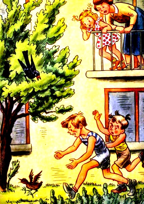 Помогите, помогите, помогите!-отчаянно закричал дроздёнок. — Помогите, помогите, помогите! — кричал он до тех пор, пока его не услышала Итка. Она подбежала к окну. Вместе с ней к окну подбежала и её мама.