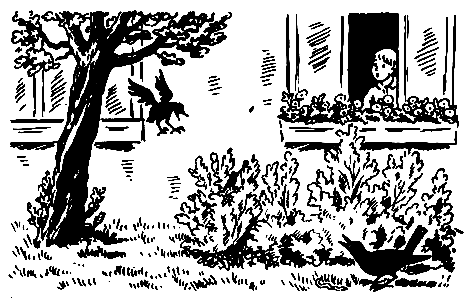 У них тоже точки. Конечно, и у птенцов певчего дрозда тоже точки. Но у них брюшко почти совсем белое. А кричат они совсем так, как ваш дроздёнок. Погоди, малыш, — сказал Громадка дроздёнку, — скоро тебя папа научит забираться на дерево, чтобы тебя не смогли поймать мальчишки. Вы видите?- внезапно спросил он. — Как там! Посмотрите-ка туда! — И он показал мальчишкам на одно из деревьев.