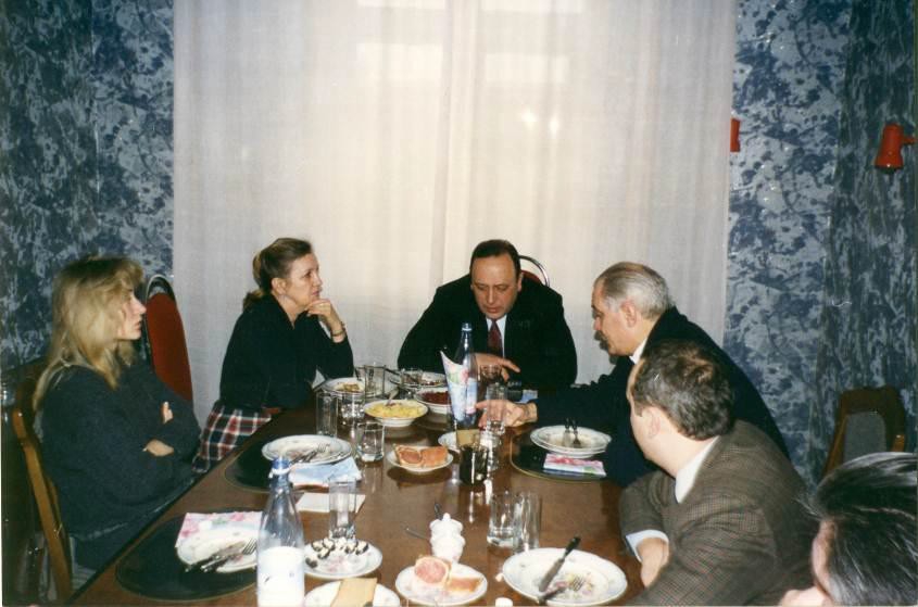 Алиса Признякова /подруга Анны и Никиты Михалкова/, посол России в Украине с супругой, Никита Михалков, Николай Ващилин в помещении Киево-Печерского банка в Киеве на беседе. 1995