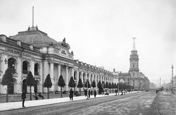 Гигантский квартал вдоль Невского проспекта от здания Городской думы до Садовой улицы и в глубину — до Чернышева переулка еще в 1740-х годах был занят деревянными торговыми лавками, которые «пожарного страха ради» было решено перестроить в каменные и превратить в новый Гостиный двор. Проект исполнил блестящий архитектор зрелого барокко Б. Ф. Растрелли. Но растреллиевский вариант, по пышности мало чем отличавшийся от его же дворцовых построек, не понравился прижимистым купцам, на деньги которых его предполагалось осуществить. Они добились отмены проекта и тут же заказали новый другому архитектору — Ж. Б. Валлен-Деламоту. Проект Деламота оказался не только гораздо скромнее и функциональнее растреллиевского, но еще и отвечал моде на зарождавшийся в стране новый архитектурный стиль — классицизм. Строительство затянулось, и Гостиный двор, прекрасный образец архитектуры раннего классицизма, был открыт только в 1785 году.