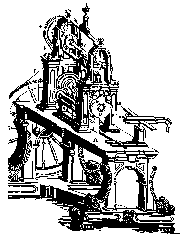 Токарно-копировальный станок А. К. Нартова для вытачивания на торцовых поверхностях тончайших рисунков — «розовая машина второго рода, в которой вытачиваются вне центра розовые фигуры».