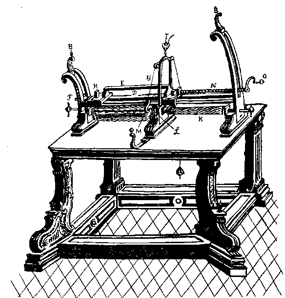 ВВ — прорезные опорные стойки; D — направляющая рама с проемными пазами; Е — рама, тянущая ползушку; F — винт; G — „струноватые" веревки, Н — ползушка с копирным пальцем; I — шпиндель; К — заготовка, у левого конца которой видна ползушка с резцом; L — делительное колесо; М — изогнутая пружина с фиксатором (не дорисовано); N — ходовой винт; О — рукоятка для привода.