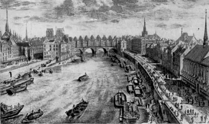Париж в годы поездки Нартова. На заднем плане мост Святого Михаила через реку Сену. По гравюре первой четверти XVIII века.