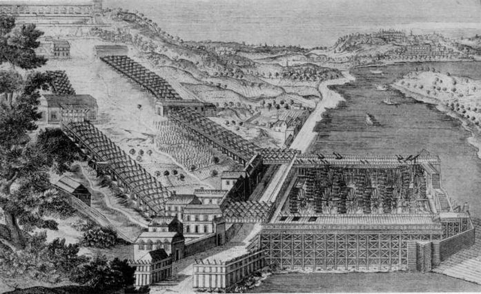 Гидросиловая установка на реке Сене в Марли, для осмотра которой А. К. Нартов совершил поездку в Версаль. По гравюре первой половины XVIII века.