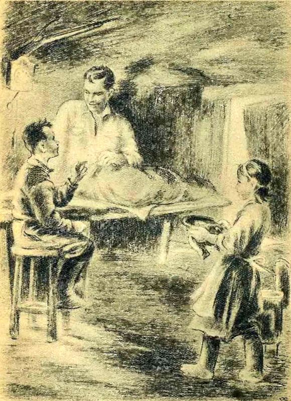 Под утро ребята добрались до глиняной пещеры. Они уложили раненого на нары и растопили печурку. Коля пошел за дровами, а Настенька принялась убирать землянку. Она вымела набившийся в щели снег и заткнула все дыры еловыми ветками.