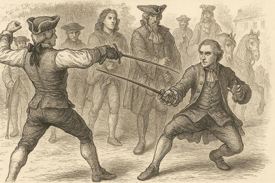 — Сошлись они. Француз слишком пьян и горяч. Брюммер лениво отбивается. Ну, звяк-звяк, публика радуется. Зрелище какое-никакое. Хотя такое тут почти каждый Божий день, но всё не сидеть, глядя в кружку. Брюммер заводит его: «Бейтесь, Серж!». Тот ругается. Но собрался как-то и бросился на нашего. Отто даже на правое колено от неожиданности упал. Тут руку то француз ему и проткнул. Брюммер опытен и ушел в падение с поворотом, пытаясь под рёбра Сержа достать. Но не успевает. Шевалье летит вслед за своей шпагой. Крутится, спотыкается спьяну и падает прямо на задницу чьей-то лошади. И под общий хохот целует её прямо под хвост. А кобыла, как водится, возьми и лягни. Французишка на ноге то почти весь лежал, так что вроде просто откинула и не зашибла. Только отлетел он прямо в припорошенную кучу навоза. Ударился о мерзлые «конские орехи» болезный. Тут такое началось!..