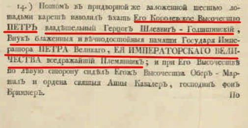 Барон Отто фон Брюммер ехал в Успенского собора с герцогом Гольштинским. Его место в церемониале тут. Берхгольц вот, к примеру, едет сейчас в карете с гофмаршалом Двора русской Императрицы Шепелевым. А фон Брюммеру же «вводить» своего герцога в Храм. За батюшку в общем.