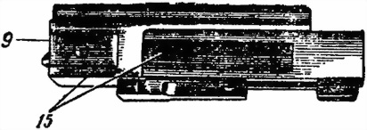 В пулеметах последнего выпуска рукоятка перезаряжания изменена (рис. 22, б). Она состоит из основания и откидной рукоятки. На основании имеются выступы для направления движения в пазу ствольной коробки и выступ в передней части основания для сцепления с затворной рамой. Откидная