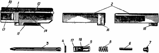а — в собранном виде; б — в разобранном виде; 1 — остов затвора; 2 — боевые упоры; 3 — ударник; 4 — шпилька ударника; 5 — выбрасыватель; 6 — ось выбрасывателя; 7 — гнеток; 8 — пружина выбрасывателя; 9 — вырез; 10 — гребень; 11 — фигурный выступ; 12 — выемы для боевых упоров; 13 — отверстие для оси выбрасывателя; 14 — отверстие для шпильки ударника; 15 — выемы для уменьшения трения; 16 — выступы боевых упоров; 17 — зацеп; 18 — вырез для оси