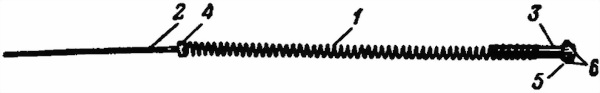 1 — возвратно-боевая пружина; 2 — поводок; 3 — стержень; 4 — венчик поводка; 5 — венчик стержня; 6 — выступы