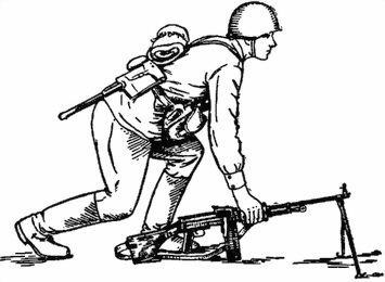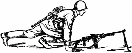 112. Если при изготовке к стрельбе с колена или стоя пулемет предварительно не был заряжен, то его необходимо вначале зарядить, а потом изготовиться. Заряжание пулемета, а также перезаряжание его при стрельбе с колена и стоя производятся лежа или с колена с предварительной установкой пулемета на сошку.