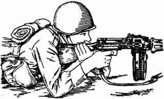 120. При стрельбе крепко удерживать приклад в плече, не меняя положения локтей. Одновременно надо стремиться удерживать ровно взятую в прорези целика мушку под точкой прицеливания. После каждой очереди быстро восстанавливать наводку.