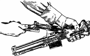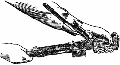 9) Проверить правильность сборки пулемета после неполной разборки, для чего один — два раза взвести и спустить затворную раму с боевого