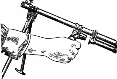 3) Присоединить рукоятку перезаряжания. Удерживая пулемет левой рукой, правой вставить в отверстие рукоятку перезаряжания и продвинуть затворную раму вперед до отказа.
