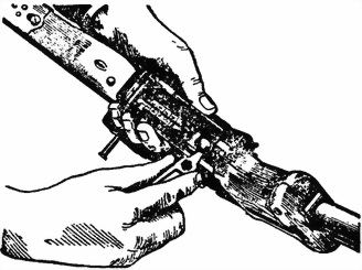 4) Разобрать механизм подачи ленты. Сжать при помощи ключа регулятора разрезную чеку и вытолкнуть ее из трубчатой оси (рис. 9); вынуть трубчатую ось.