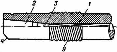 а — казенная часть в разрезе; б — наружный вид; 1 — нарезная часть; 2 — патронник; 3 — пульный вход; 4 — вырез для выбрасывателя; 5 — муфта; 6 — основание мушки с мушкой; 7 — газовая камора с регулятором; 8 — газовая трубка; 9 — резьба