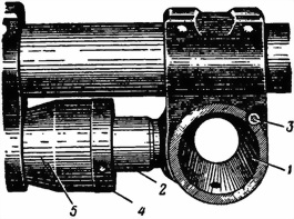 а — пулеметов последнего выпуска; б — пулеметов первого выпуска; 1 — поперечное отверстие для регулятора; 2 — патрубок; 3 — стопор; 4 — цилиндрическая втулка; 5 — коническая втулка