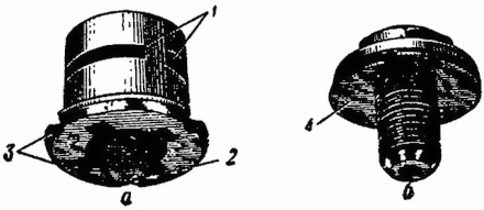 а — регулятор; б — винт регулятора; 1 — канавки; 2 — венчик; 3 — вырезы для стопора; 4 — пружинная шайба