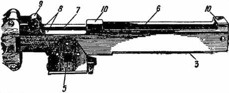 а — вид слева; б — вид снизу; 1 — направляющие пазы; 2 — отражатель; 3 — пазы для спусковой рамы; 4 — чека; 5 — кронштейн; 6 — продольное окно; 7 — окно для прохода патрона; 8 — вырез для основания приемника; 9 — ушко; 10 — перемычки