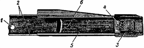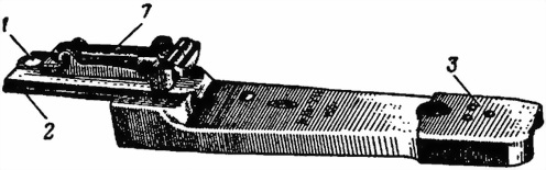 а — вид слева; б — вид снизу; 1 — отверстие для кольцевого выступа большого рычага; 2 — направляющие выступы для колодки приемника; 3 — защелка; 4 — планка; 5 — пластинчатая пружина; 6 — ось малого рычага; 7 — прицел