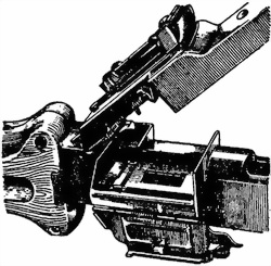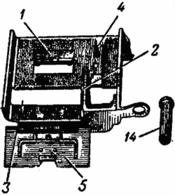 17. Приемник (рис. 17) служит для подачи ленты с патронами при стрельбе. Он состоит из основания, колодки и механизма подачи ленты. Основание вместе с колодкой образуют поперечное окно, по которому движется лента с патронами.