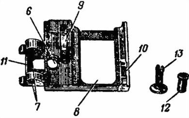 15. Кронштейн (рис. 15) служит для присоединения к пулемету коробки с лентой. Он прикреплен к ствольной коробке с левой стороны и имеет выступы, на которые надвигается своим зацепом коробка, и флажок с осью и пластинчатой пружиной для закрепления коробки на кронштейне.