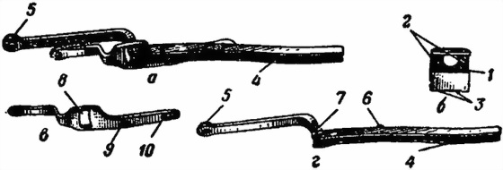 а — рычаги подачи в собранием виде; б — подаватель; в — малый рычаг подачи; г — большой рычаг подачи; 1 — продольный вырез подавателя; 2 — направляющие пазы подавателя; 3 — пальцы подачи; 4 — криволинейный паз; 5 — кольцевой выступ; 6 — выступ, приводящий в движение малый рычаг; 7 — выступ, препятствующий подъему малого рычага вверх; 8 — отверстие для прохода большого рычага; 9 — отверстие для оси; 10 — отверстие для выступа большого рычага