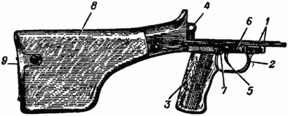 1 — продольные выступы для соединения со ствольной коробкой; 2 — спусковая скоба; 3 — пистолетная рукоятка; 4 — проушины для чеки; 5 — спусковой крючок; 6 — предохранитель; 7 — зуб предохранителя; 8 — приклад; 9 — затыльник