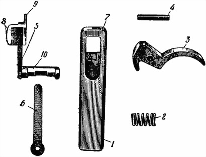 1 — спусковой рычаг; 2 — пружина спускового рычага; 3 — спусковой крючок; 4 — ось спускового крючка; 5 — предохранитель; 6 — пружина предохранителя; 7 — шептало; 8 — флажок предохранителя; 9 — зуб предохранителя; 10 — вырез