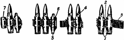 27. Лента (рис. 28) служит для помещения патронов и подачи их в приемник. Лента на 100 патронов составляется из двух частей, соединяемых при помощи патрона, вставляемого в соединительное звено при снаряжении. Лента состоит из звеньев, которые соединяются при помощи соединительных пружин. Звено ленты в задней части имеет ограничительный выступ, а в передней — направляющий выступ.