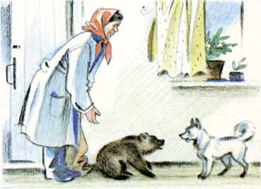 И вот так вот и оказался медвежонок Минька в питомцах у тётки Устиньи, а дружиться с ним стала маленькая собачка по кличке Кружечка.