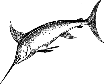 Что касается меч-рыбы, то эту во многом загадочную рыбу так описывает писатель-маринист Л. Скрягин: «Ее длинное, сжатое с боков тело прекрасно приспособлено для плавания. У рыбы два спинных плавника, один из которых длинный и острый, а другой короткий. Хвостовой плавник напоминает полумесяц. Вместо чешуи тело покрыто мелкими бугорками, сверху оно голубого цвета с красноватым отливом. К брюху этот цвет переходит в синий. Меч хищника образовался из сильно вытянутой вперед верхней челюсти и межчелюстной кости. Он необыкновенно прочен и является грозным оружием, Но, как ни странно, питается меч-рыба только мелкой рыбой и каракатицами. Иногда в открытом море можно наблюдать так называемый „танец смерти“ меч-рыбы. Ворвавшись в стаю макрели или скумбрии, она выпрыгивает на 5–6 местров из воды и падает плашмя, глушит рыбу ударами своего тела. Сделав три-четыре таких прыжка, рыба-меч уходит под воду и с быстротой молнии начинает наносить удары своим мечом то в одну, то в другую сторону, пронзая свои жертвы…» [82]