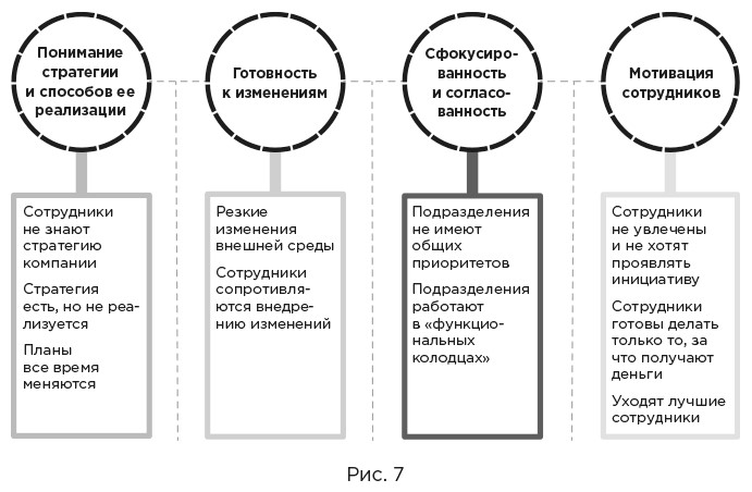 Их можно объединить в четыре основные группы: понимание стратегии и способа ее реализации, готовность к изменениям, сфокусированность и согласованность, а также мотивация сотрудников.