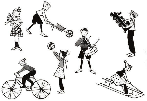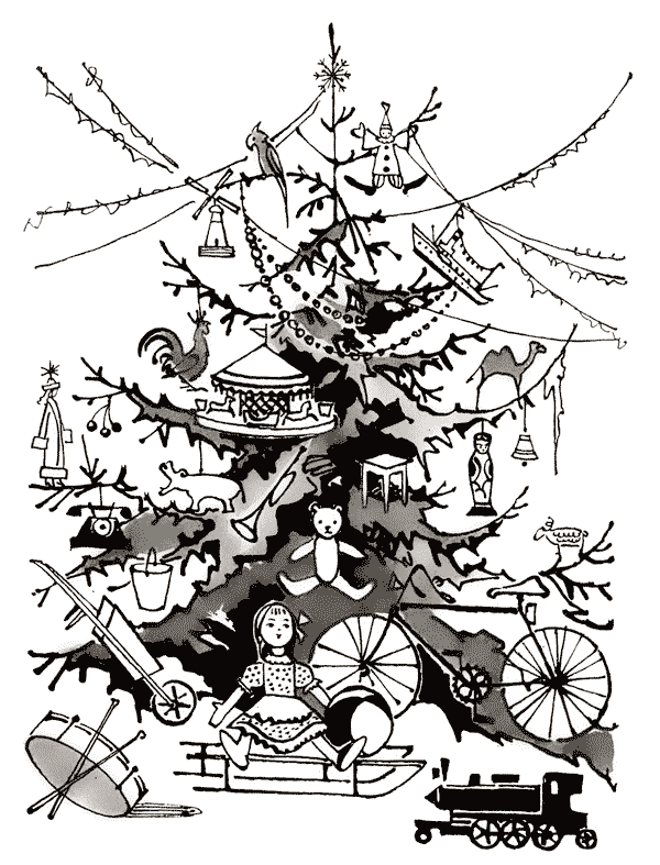 Этих детей зовут: Катя, Володя, Толя, Соня, Петя, Машенька и Боря. А кто — Боря, кто — Володя, мы не скажем. Сам угадай. Они тоже сами догадались, кому какой подарок лежит под ёлкой. Знаешь, как они это сделали? Сперва решали задачу: каждый должен был найти на ёлке три украшения. Все три начинаются с той буквы, с которой начинается его имя. Например, Соня должна была указать три игрушки на букву «С». А после этого они находили подарок — он тоже начинался на ту же букву. Так они и разобрались. А ты сможешь найти на ёлке те игрушки, которые нашёл каждый из детей? Сможешь угадать, как кого зовут?
