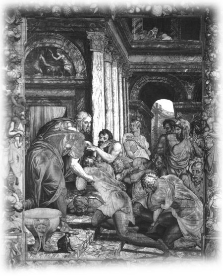 Начался обыск со старшего, и когда дошло до младшего и в мешке его нашлась чаша, тогда братья в ужасе разодрали на себе одежды и возвратились в город. Пришли к Иосифу и пали перед ним на землю. «Как это вы сделали такое?» – сказал им Иосиф. Иуда выступил из среды братьев и отвечал: «Что сказать господину нашему?.. Что отвечать?.. Чем оправдываться?.. Бог наказал нас за грехи наши, и вот мы все твои рабы!» – «Нет, – сказал Иосиф, – этого я не сделаю. Тот, у кого нашлась чаша, будет моим рабом, а вы пойдите с миром к своему отцу». Тогда Иуда стал просить, чтобы