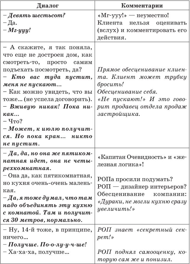 Результат: РОП поработал автоответчиком. Потратил рабочее время и деньги компании, так как получает оклад. Но остался доволен проведенной беседой. И, наверное, ждет, что покупатель самой дорогой квартиры в строящемся доме сам приедет к нему в офис и попросит, чтобы с ним заключили договор.