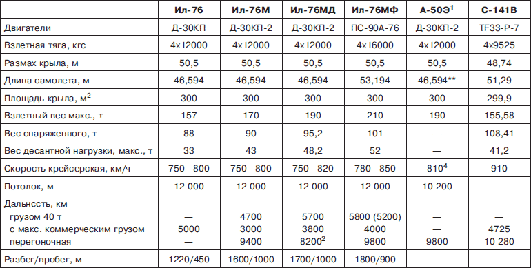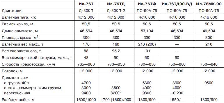 Основные данные гражданских самолетов семейства Ил-76 и самолета-заправщика Ил-78МК