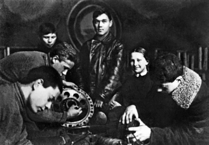 А.С. Яковлев (в центре) среди кружковцев Общества друзей воздушного флота