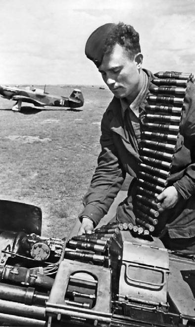 Як-3, июнь 1943 года, район Курска. Старшина П.М. Романов за зарядкой оружия