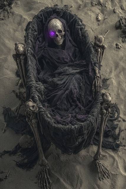 На песке стояла колыбель. Но не простая, а собранная из костей (из чего еще я, собственно, должен был ее сделать?) и способная самостоятельно перемещаться. Внутри же, небрежно накрытое грязной черной тканью, лежало тело.