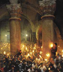 Святой огонь нисходит в храм Гроба Господня только в Великую Субботу — накануне православной Пасхи, хотя празднуется Пасха каждый год в разные дни по старому, юлианскому календарю. И еще одна особенность — Благодатный огонь сходит только по молитвам православного патриарха. Как-то раз в ХVI веке другая община, жившая в Иерусалиме, — армяне, тоже христиане, но отступившие от святого Православия еще в IV веке, — подкупила турецкие власти, чтобы последние именно их, а не православного патриарха в Великую Субботу допустили в пещеру — Гроб Господень. Долго и безуспешно молились армянские первосвященники, а православный Иерусалимский патриарх вместе со своей паствой плакал на улице у запертых дверей храма. И вот неожиданно как бы молния ударила в мраморную колонну, она рассеклась, и из нее вышел столп огня, который зажег свечи у православных.