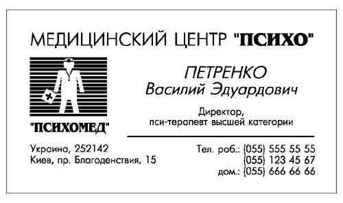 Визитка перегружена логотипом (особенно в графической форме). Обычно такое оформление предпочитают молодые, незрелые фирмы, у которых еще не отработаны технологии (таргет-классы), проще говоря, они не знают, кого и как завлечь, хоть желания им не занимать, да и возможности, видимо, имеются. Многообразие элементов визитки – это всегда распыление психовоздействующего импульса.