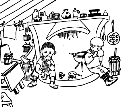 Зимой, по ночам, у них в избушке было холодно. Каждый вечер отец Саммэльагуста нагревал у огня большую овчину, которой укутывал на ночь пятерых своих мальчишек. Под овчиной было тепло и здорово! А вот каково было выползать из-под овчины по утрам — можете себе представить! В избушке стоял такой холод, что в бочке на кухне замерзала вода! Отцу Саммэльагуста приходилось пестиком из ступки колоть в бочке лёд — это первое, что он делал зимой по утрам.