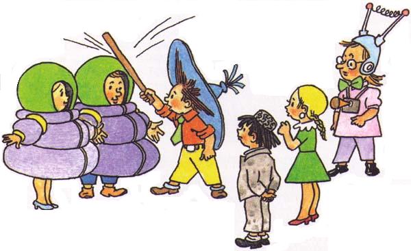 Наконец все были готовы и уже хотели выйти из дому, но тут кто-то постучал в дверь, и в комнату вошел Кубик. На нем была какая-то смешная шапочка из голубой пластмассы с двумя длинными рожками, между которыми была натянута спиральная проволока; на ушах были радионаушники, а на груди висела плоская металлическая коробочка с торчащим рупором. Еще одна такая же коробочка находилась у него на спине.