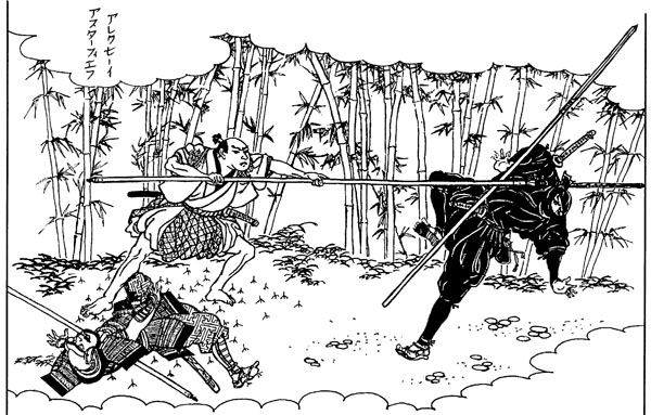 Ниндзя сражен ударом копья. Рисунок по мотивам японских гравюр