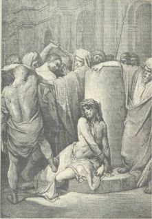 И плевали на Него и, взяв трость, били Его по голове когда насмеялись над Ним, сняли с Него багряницу и одели Его в одежды Его, и повели Его на распятие» (Матф. 27: 24-31)