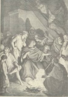 В это время Петр, следовавший за Иисусом неотступно от самого Гефсиманского сада, стоял во дворе. Ночь была довольно холодной, особенно с приближением утра. Во дворе вместе с Петром были и другие люди – работники, прислуга, приезжие из дальних мест, прибывшие за помощью к синедриону. Служанка развела огонь, и многие подошли погреться. Служанка, вглядевшись в Петра, сказала: